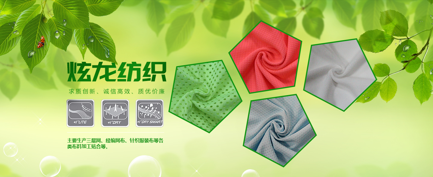 泉州市炫龍紡織科技有限公司位于中國福建晉江--中國鞋都,是一家集研發(fā)、生產(chǎn)、銷售為一體的紡織企業(yè)公司。主要生產(chǎn):三層網(wǎng)、經(jīng)編網(wǎng)布、針織服裝布、休閑時尚女裝網(wǎng)布、鞋用各類BK布、拉毛布、大小提花布、賈卡提花、3D飛織、各類布料加工貼合等。 公司秉承“求質(zhì)創(chuàng)新、誠信高效、質(zhì)優(yōu)價廉”的經(jīng)營理念為宗旨,竭誠為廣大海內(nèi)外客戶求創(chuàng)一流的服務及優(yōu)質(zhì)的品質(zhì),歡迎海內(nèi)外的客戶供樣、定制及洽談合作。
